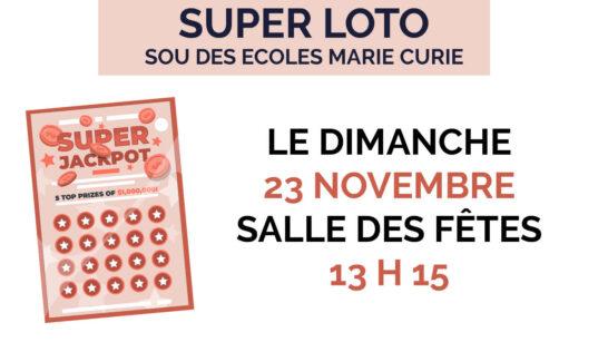 Loto du Sou des Ecoles Marie-Curie le dimanche 23 novembre à la salle des Fêtes Ouverture des portes 13h15 Pour plus de renseignements : 06 79 20 19 67